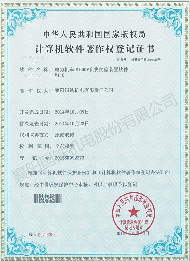 電力機車DC600V負載實驗裝置軟件(軟件著作權證書)